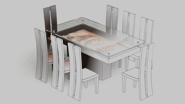 the design consists of wooden table, glass,crystals and marble mosaics sheet inside of the table.